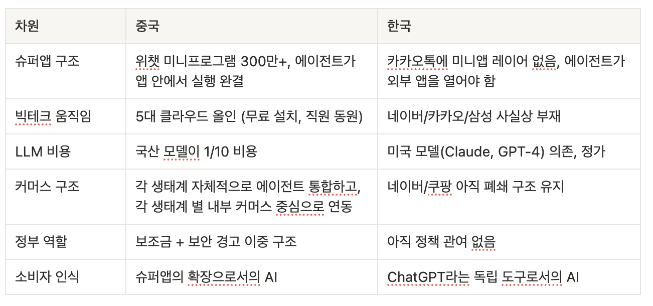 그런데 카카오톡에는 위챗의 미니프로그램(300만+)에 해당하는 서비스 생태계가 거의 없다. 중국에서 AI 에이전트가 “배달 주문해줘”라고 하면 위챗 안에서 실행이 완결되지만, 한국에서는 결국 카카오톡을 벗어나 배민 앱을 열어야 한다. 이 아키텍처적 차이가 한국에서 소비자-AI 접점이 어떤 형태로 발전할지를 결정하는 가장 중요한 구조적 요인의 하나라고 본다.